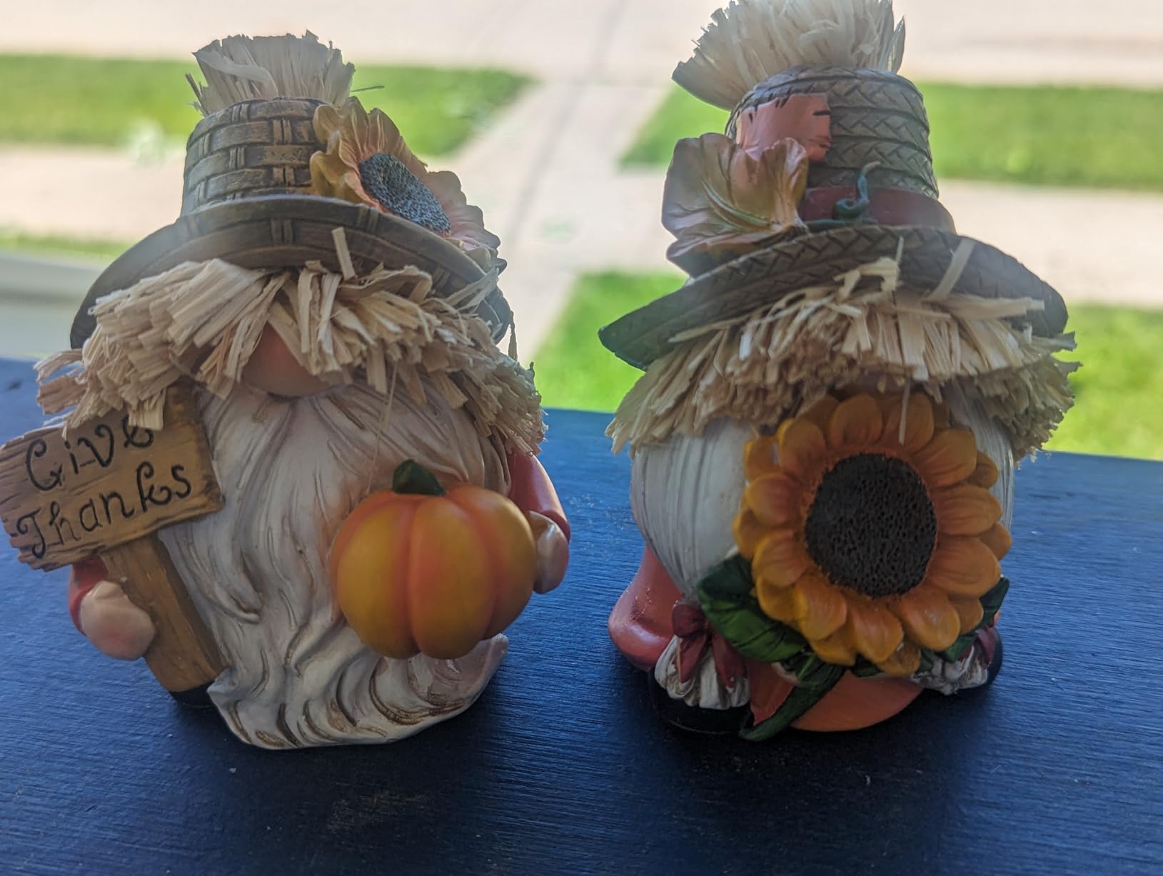These two cute scarecrow gnomes, a gnome holds a wooden sign with the words “GIVE THANKS”carved in its hand , and the design of pumpkin, maple leaf and sunflower is full of autumn atmosphere. The hats on their heads and the embellishment of artificial grass make the pair of elves more lifelike. I believe you must hope to have this lovely pair of dwarfs to accompany your family or friends to spend this beautiful autumn.